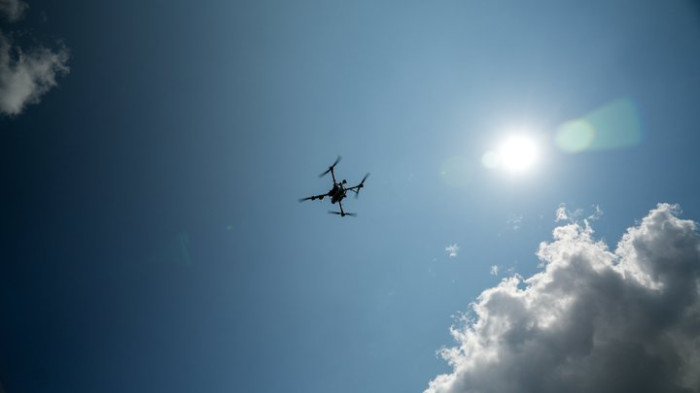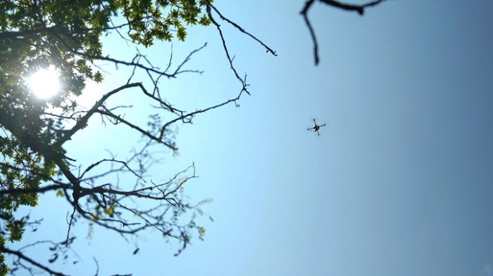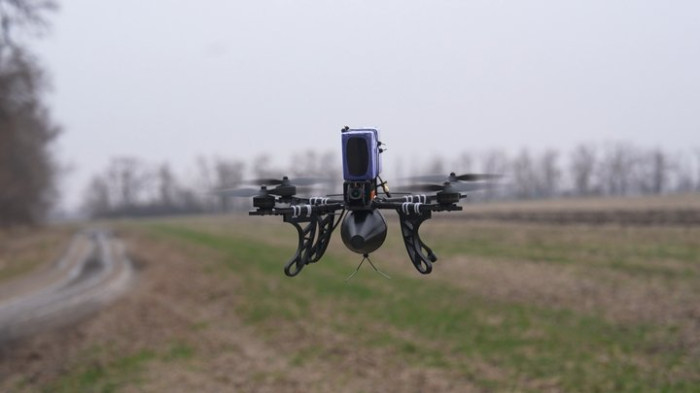 Дрон 159 батальйону 118 бригади ТрО висить у повітрі з прикріпленою посилкою для піхоти. Андрій Варьонов/Суспільне Запоріжжя