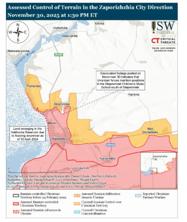 Орієнтовна ситуація на лінії фронту поблизу Степногірська Запорізької області станом на 30 листопада 2025 року за версією аналітиків Інституту вивчення війни. Скриншот з ISW