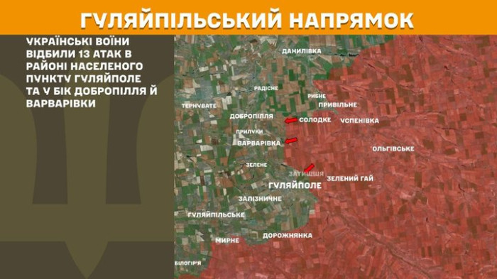Водночас на Гуляйпільському відтинку фронту Сили оборони відбили 13 штурмів російської армії в районі Гуляйполя, у бік Добропілля та Варварівки.