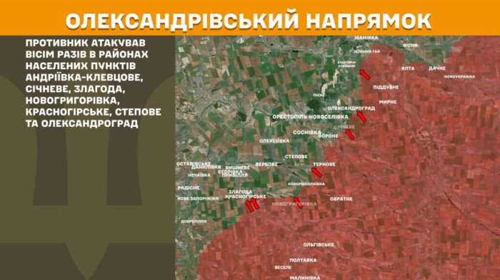 Ще вісім разів ворог атакував на Олександрівському напрямку в районах населених пунктів Андріївка-Клевцове, Січневе, Злагода, Новогригорівка, Красногірське, Степове та Олександроград.