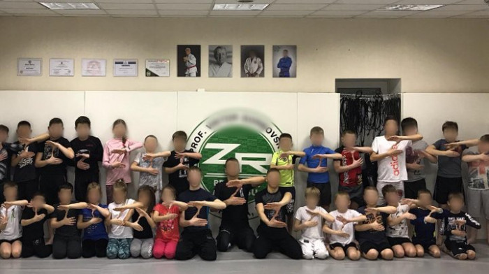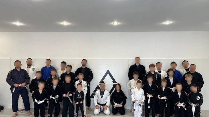 Віктор (по центру в білому кімоно), тренер із Запоріжжя, якого затримали правоохоронці за підозрою у сексуальному насильстві над 11-річною дівчинкою. Спортивна зала для занять джиу-джитсу в Києві. Соцмережі Віктора