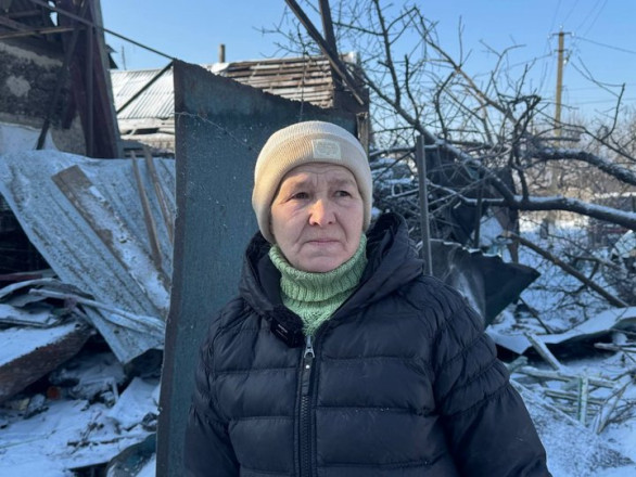 "Коли був перший вибух, я була ще в ліжку, і на мене все скло посипалося. Коли був другий вибух, я була на вулиці й за кутком сховалася. У мене жодних вцілілих меблів. Діти приїхали, допомогли плівкою оббити, піч розпалили, але даху ж нема. Коли буде відлига, звісно, стеля на голову впаде. Але поки можна, буду залишатися… Куди я поїду?"