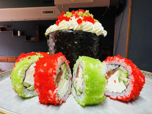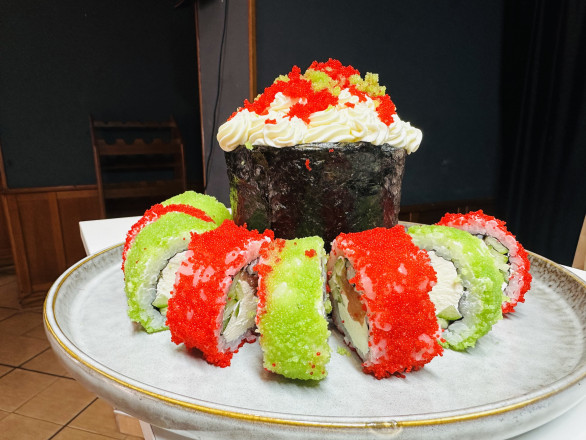 "Ми помітили, що на свята замовлень дуже багато, тому вирішили поекспериментувати. У складі такої "паски": рис, крем-сир, вугор, ікра, лосось та огірок. Замість традиційних крашанок набір доповнює різнокольоровий рол. Вага страви — майже кілограм".