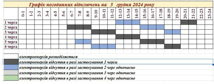 За інформацією НЕК «Укренерго», завтра, 05 грудня, на підконтрольній частині Запорізької області з 06:00 до 07:00 та з 20:00 до 22:00 вимикатимуть одну чергу, з 07:00 до 20:00 – дві черги одночасно: