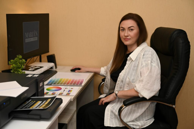 Після евакуації з Бердянська через війну Олена Маричева опинилася у Запоріжжі з чоловіком та сином, де була змушена починати життя майже з нуля. Дизайнерка інтер’єрів швидко знайшла новий напрямок у графічному дизайні та завдяки грантовим програмам розширила свої послуги до друку блокнотів, візиток та сертифікатів.