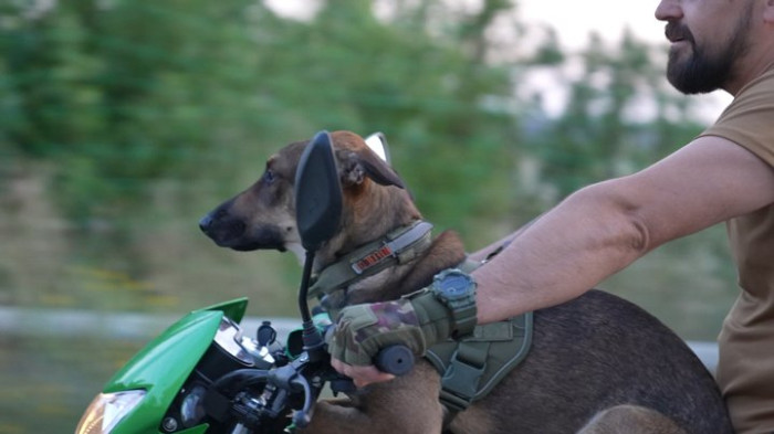 Собака дуже любить їздити на позиції та знає, що перед виходом, як усі військові, має одягати спеціальну амуніцію, каже Ігор: