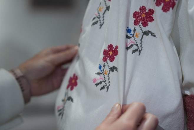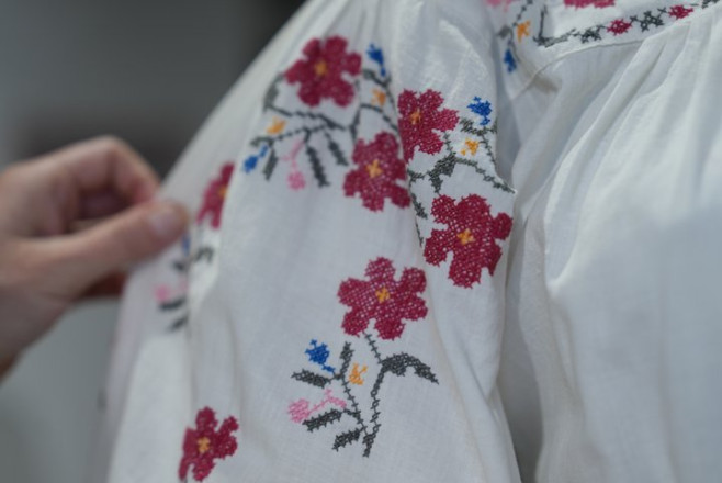 "Ця сорочка була вишита моєю прабабусею, Брегедою Марією, під час заслання за озеро Байкал. Вони жили всією родиною селі Андріївка Бердянського району, з чоловіком, якого заслали на Беломорканал, і там він пропав без вісти".