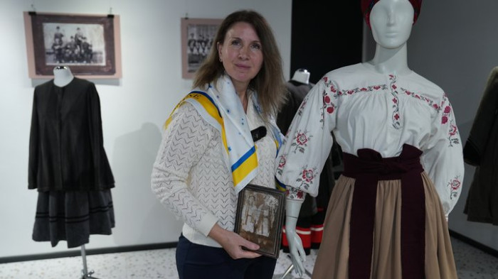 Світлана Сукач біля автентичної вишиванки своєї родини, представленої на виставці «Врятована спадщина» у Запоріжжі. Суспільне Запоріжжя