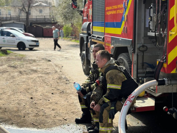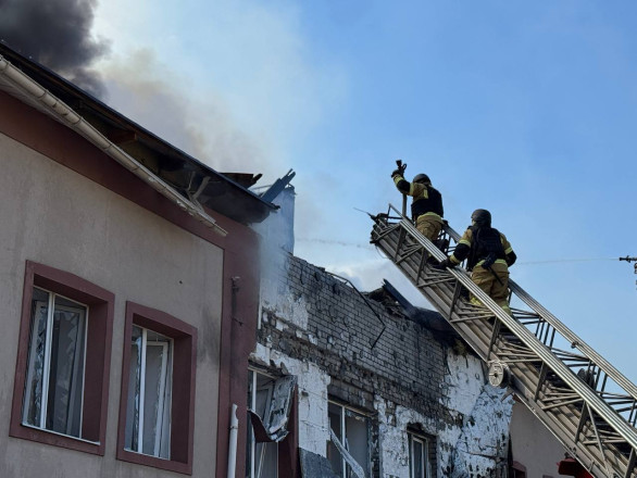 Пожежа на місці пошкодженої будівлі у Запоріжжі внаслідок російського обстрілу 13 квітня 2026 року. Суспільне Запоріжжя