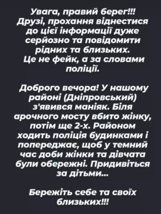 Впродовж доби в мережі шириться інформація про те, що у Дніпровському районі Запоріжжі поблизу аркового мосту орудує маніяк, і вже є кілька жінок, загиблих чи постраждалих від його злочинних дій. Водночас правоохоронці спростовують цю інформацію.