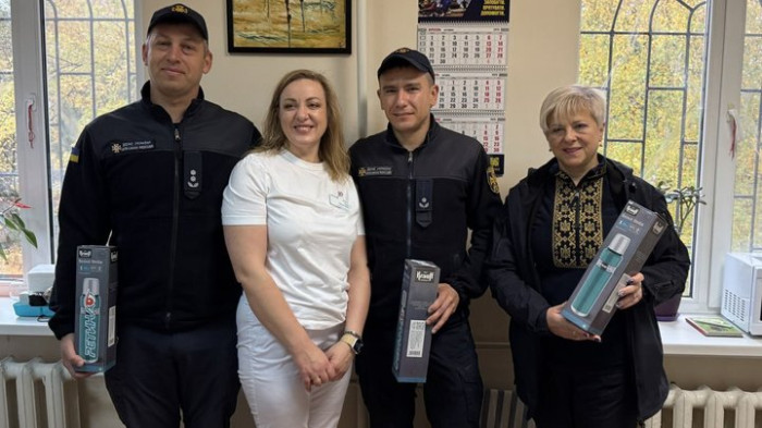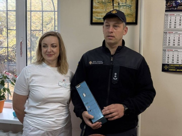 Керівниця приватної офтальмологічної клініки Віра Дєдова привітала працівника ДСНС Сергія Цопу та психолога Іллю Бородовко з Днем рятівника, який відзначався 17 вересня, та вручила символічні подарунки.