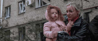 Мурал із зображенням дівчинки, яка збирає квіти серед уламків боєприпасів, на стіні коледжу «Моторобудівник» у Запоріжжі. Суспільне Запоріжжя