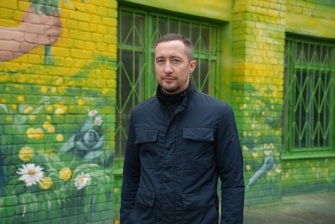 Директор благодійного фонду Максим Кравчук біля муралу про мінну безпеку, створеного у Запоріжжі. Суспільне Запоріжжя