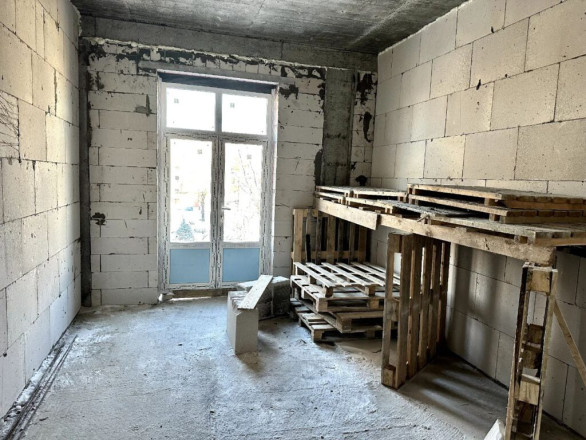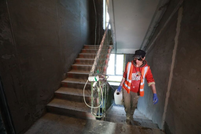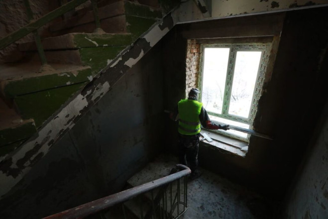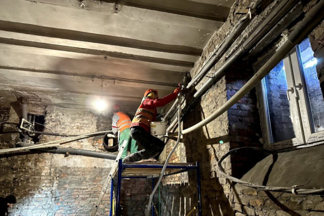 У під’їзді будинку, що відновлюється, встановлені вікна і накрита гідробар’єром покрівля. У підвалі, де облаштують укриття, продовжуються штукатурні роботи.