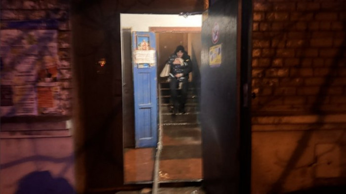 Рятувальник виносить дитину із під’їзду, де сталася пожежа. Запоріжжя, 22 грудня 2025 року. ГУ ДСНС України у Запорізькій області