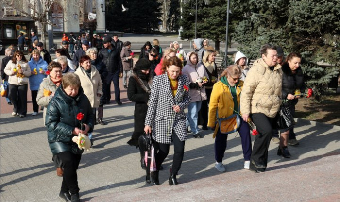 Запоріжці, котрі прийшли вшанувати пам’ять загиблих внаслідок авіаудару РФ по Маріупольському драмтеатру 16 березня 2022 року. ЗОВА