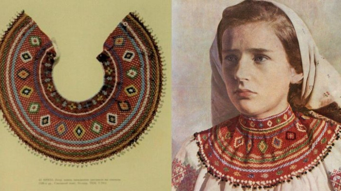 spadok.org.uaШирокий бісерний комір, який щільно прилягає до шиї або плечей і є частиною народного строю., прикраси з гірського кришталю, "голубки"Невеликі бісерні підвіски або сережки у формі пари голубів, чоловічі прикраси, стрічкові ґердани