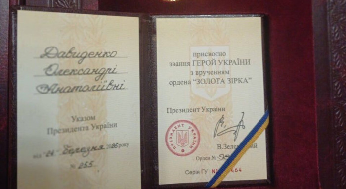 «За особисту мужність і героїзм, виявлені у захисті державного суверенітету та територіальної цілісності України, самовіддане служіння українському народу присвоїти звання Герой України з врученням ордена «Золота Зірка» Давиденко Олександрі Анатоліївні — старшому солдату», — зазначається в указі президента України.