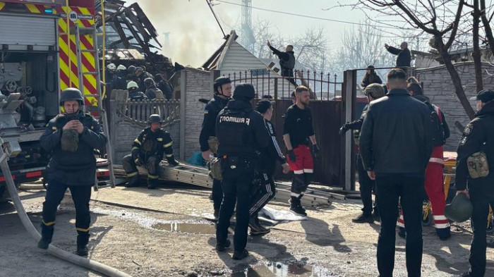Екстрені служби працюють серед руїн зруйнованих житлових будинків у Запоріжжі, 16 березня 2026 року. Суспільне Запоріжжя