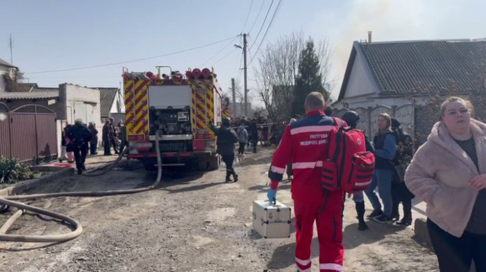Надзвичайники, комунальники, поліція та медики на місці російського обстрілу. Запоріжжя, 16 березня 2026 року. Суспільне Запоріжжя