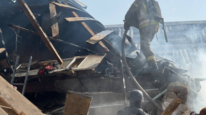 На місці російського обстрілу декілька бригад рятувальників, медиків та поліції працюють серед руїн зруйнованих будинків — під понівеченими конструкціями перебували дві людини.