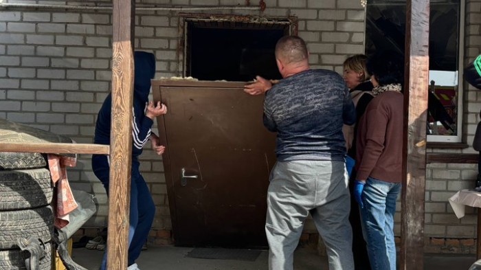 Сусіди та друзі родини Тетяни допомагають прибрати на ґанку повівеченого обстрілом будинку в Запоріжжі, 16 березня 2026 року. Суспільне Запоріжжя