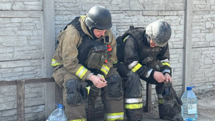 Рятувальники перепочивають на місці російського обстрілу Запоріжжя, 16 березня 2026 року. Суспільне Запоріжжя