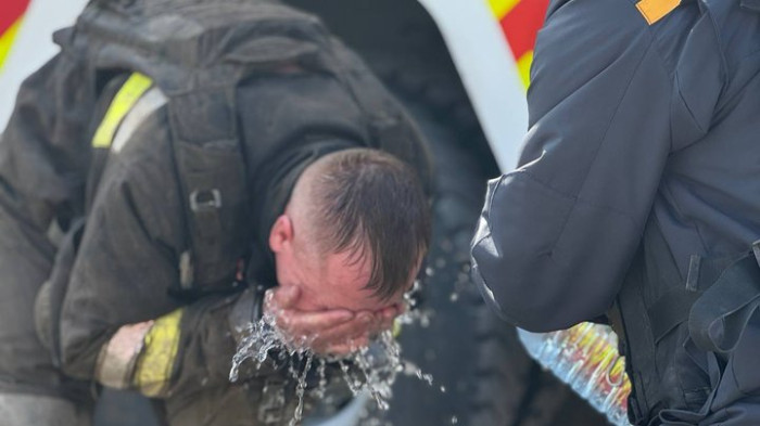 Рятувальник вмивається водою після розбору завалів будинку. Запоріжжя, 16 березня 2026 року. Суспільне Запоріжжя