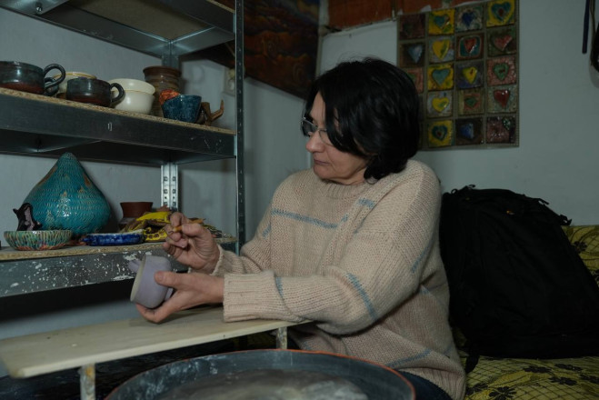 "Спочатку я познайомилася з місцевими художниками, відновила свої заняття живописом і почала картини якісь створювати. Деякий час ми були вуличними художниками. На вулиці ми розвішували картини та намагалися продавати. Через деякий час ми зрозуміли, що живопис – добре, але кераміка – краще".