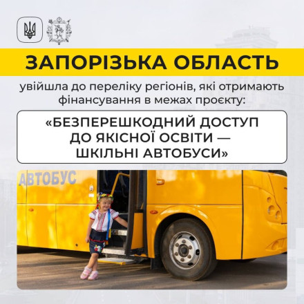Так, Запорізька область увійшла до переліку регіонів, які отримають фінансування в межах проєкту «Безперешкодний доступ до якісної освіти — шкільні автобуси».