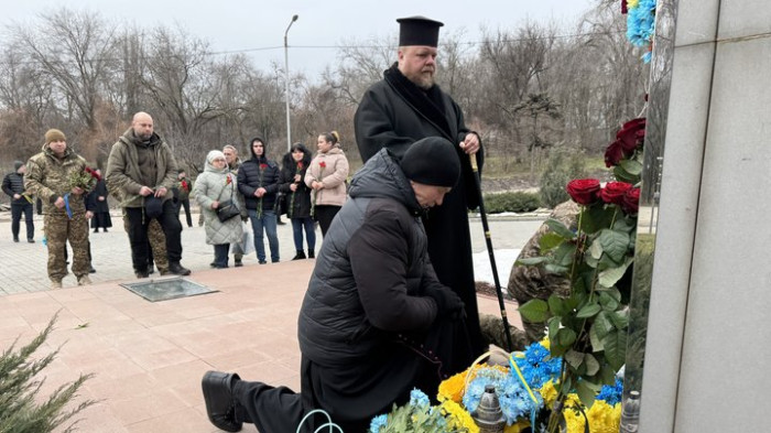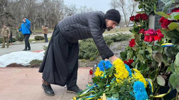 Священник кладе квіти до меморіалу «Честь і Гідність». Суспільне Запоріжжя