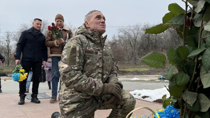 Військовий став на коліно у знак вшанування пам’яті Героїв Небесної Сотні. Суспільне Запоріжжя