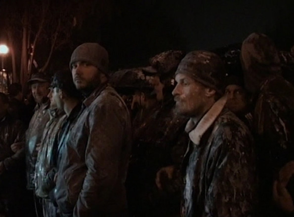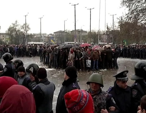 Проросійські мітингувальники з борошном на тілі та одязі навечір 13 квітня 2014 року в Запоріжжі. Архів Суспільне Запоріжжя