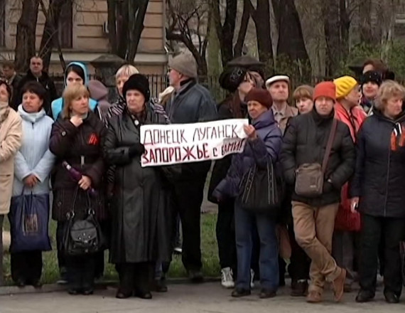 Проросійські мітингувальники з плакатом «Донецьк, Луганськ, Запоріжжя з вами» у середмісті, 13 квітня 2014 року. Архів Суспільне Запоріжжя