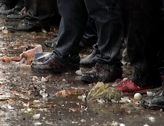 Купа з розбитих яєць, борошна та інших продуктів, якими закидати проросійських мітингувальників у Запоріжжі 13 квітня 2014 року. Архів Суспільне Запоріжжя