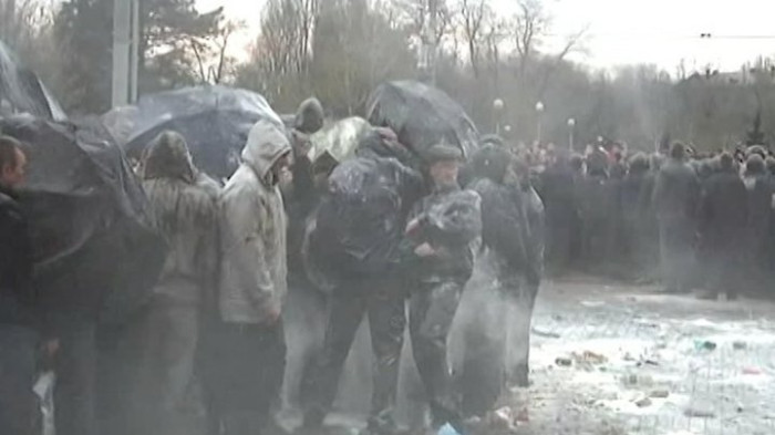 Проросійські мітингувальники, оточені проукраїнськими активістами, котрі обкидують їх борошном, яйцями, томатною пастою та оселедцями. Запоріжжя, 13 квітня 2014 року. Архів Суспільне Запоріжжя