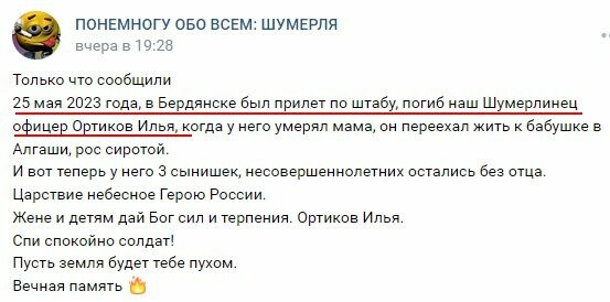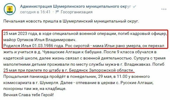 Опублікувано некролог по майору російської армії Іллі Ортікову. Заявляється, що Ортіков загинув внаслідок ураження штабу в Бердянську 25 травня. Окупанта поховають у селі Руські Алгаші на Чувашії.