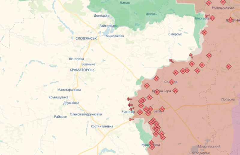 Краматорський плацдарм: поки була можливість їхати на здобутках Бахмутської офензиви, ворог на них і їхав, але кінь Вагнер умер і справа пішла не так жваво. Зараз головні сили 3-ї армії та угруповання ПДВ (головні сили 98-ї ПДД) вперлися в канал Сіверський Донець — Донбас, щодня перетинають його, не можуть закріпитися, відкочуються на вихідні рубежі, намагаються пробитися на Ступочки вздовж шосе Бахмут — Покровськ.