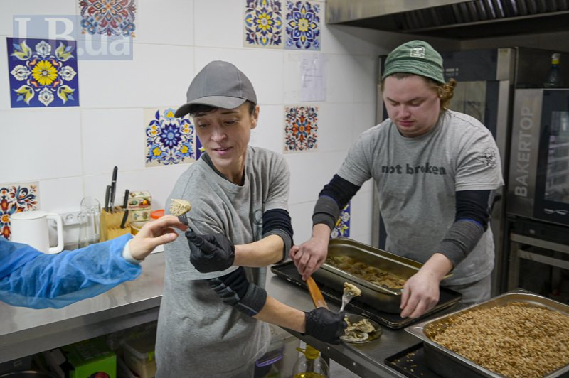 До видачі ще кілька годин, а котлети й гречка вже готові рушати в духовку. Паралельно Денис помішує на плиті грибний соус. У сусідній кімнаті туди-сюди ходить Саша. Каже, переживає, щоб усе вдалося. Наталя й Александріна заспокоюють — усе буде класно, он уже як смачно пахне по всій кухні.