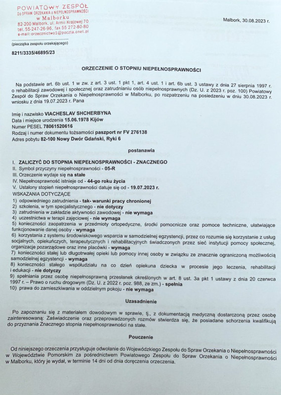 Звернулися по довідку про групу інвалідності європейського зразка, аби була можливість паркувати автівку на відповідних місцях. Рішення про групу в Польщі приймає сімейний лікар. На відміну від української МСЕК, йому не потрібні стоси документів, тільки переклад висновків українських колег. У країні, яка не повинна визнавати ветеранів-сусідів і віддячувати їм, український військовий отримав першу групу інвалідності майже автоматично: чоловік зайшов до кабінету сімейника, той сказав одну фразу: «Я все бачу».