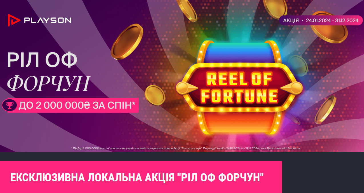 Водночас з «Ріл оф форчун» на FAVBET проходить ще одна велика акція від Playson — «Нон-стоп дропс» з ₴160 000 000 призових. Це — велике мережеве промо, що об’єднує турніри з механікою випадкових виграшних «дропів». Гарна новина в тому, що деякі з акційних слотів тут співпадають з «Колесом фортуни», тож є шанс дійсно великого виграшу.