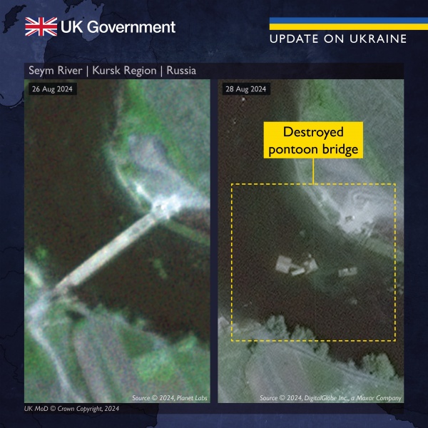 Українські війська зруйнували низку мостів та понтонних переправ росіян у Курській області. Британська розвідка показала нові супутникові знімки.