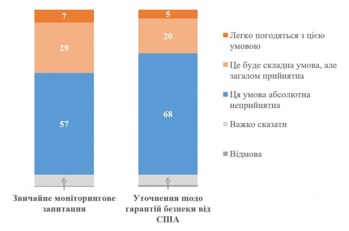 - Уточнене формулювання (реалістичний сценарій): Коли соціологи уточнили, що США нададуть гарантії тільки після виведення військ, і при цьому не розміщуватимуть свої війська, не закриватимуть небо і не даватимуть зброю безкоштовно, рівень неприйняття різко зріс. У такому разі вже 68% українців кажуть рішуче «ні» подібним угодам.