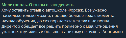 “Хочу залишити відгук про автошколу Форсаж. Все жахливо, наскільки це тільки можливо, минуло більше року з моменту початку навчання, досі на іспит так і не потрапив. Директор обіцяє все вирішити приблизно з травня. Стосунки жахливі, відучилися і більше ви нікому не потрібні”, — пишуть мелітопольці.