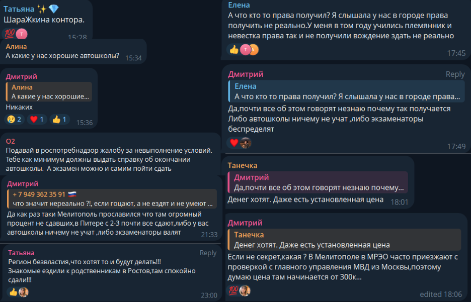 Один із користувачів пропонує юридичний шлях — піти зі скаргою у Росспоживнагляд, хоч і без особливої віри в результат. Однак навіть такі поради звучать радше як теорія. На практиці, як визнають самі мешканці, Мелітополь уже давно має репутацію міста з аномально низьким відсотком успішно складених іспитів.