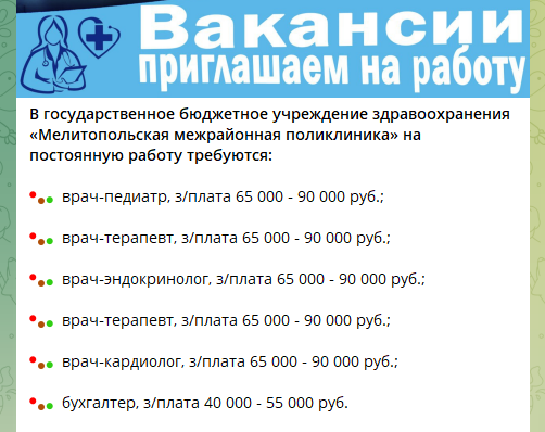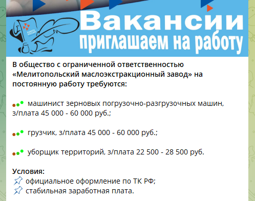 Середня заробітна плата в Мелітополі становить 45 — 50 тисяч рублів. Для порівняння, середня пенсія в місті — 20 тисяч рублів. Але ці цифри приховують глибшу проблему: доходи розпорошені й нестійкі. Вакансії в місцевих установах показують реальний розмір заробітків: