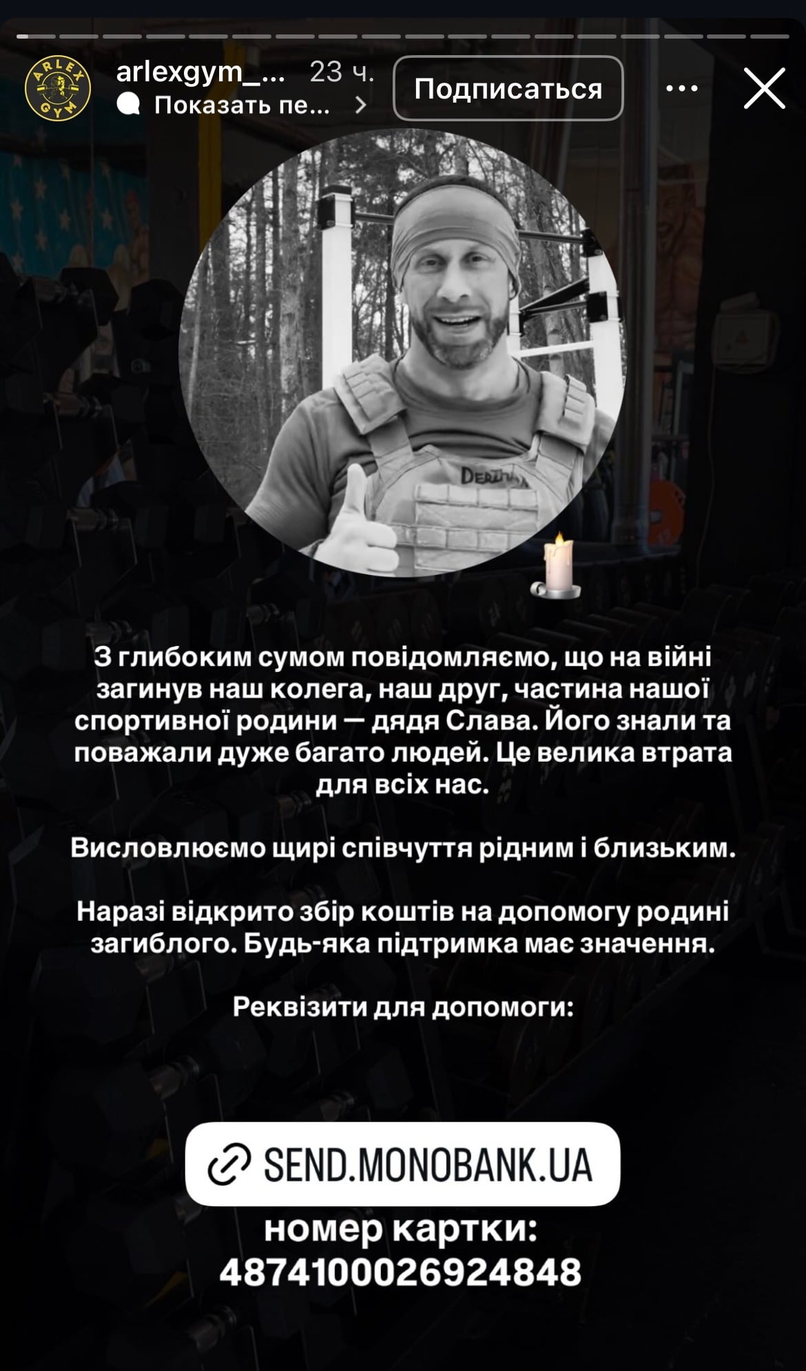 «З глибоким сумом повідомляємо, що на війні загинув наш колега, наш друг, частина нашої спортивної родини — Дядя Слава. Його знали та поважали дуже багато людей. Це велика втрата для всіх нас», — йдеться у повідомленні.