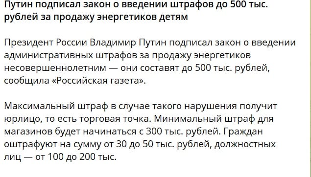 Відповідний закон підписав президент РФ Володимир Путін, повідомляють пропагандистські ресурси. Згідно з документом, за продаж енергетичних напоїв неповнолітнім передбачені серйозні адміністративні санкції. Громадян оштрафують на суму від 30 до 50 тисяч рублів, посадових осіб — від 100 до 200 тисяч. Максимальний штраф у 500 тисяч рублів загрожує юридичним особам, тобто власникам магазинів.