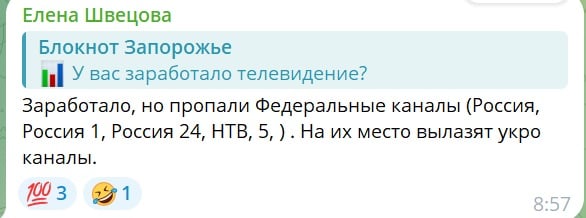 «Запрацювало, але зникли федеральні канали (Росія 1, Росія 24, НТВ, 5). На їх місце вилазять укро-канали», — повідомляють здивовані мелітопольці.
